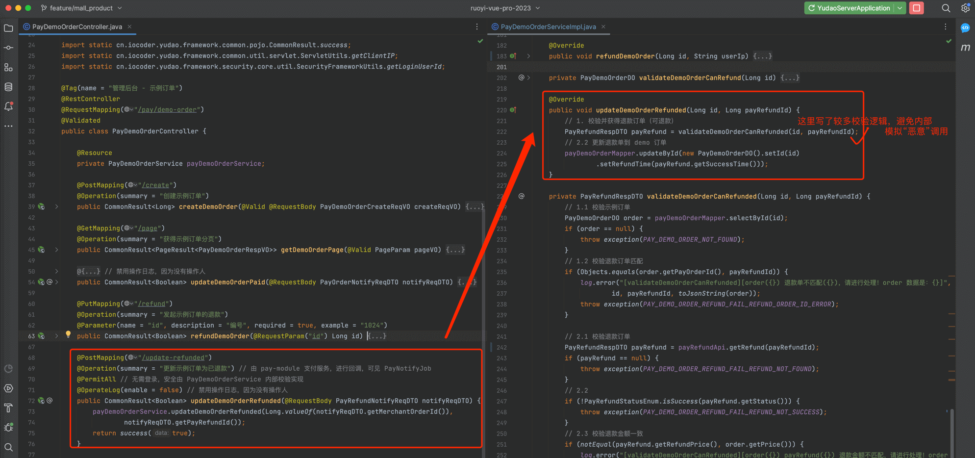 在 demo 模块所在的 yudao-module-xx 模块,实现一个支付回调的接口,提供给支付【中心】回调。对应的代码在 PayDemoOrderController 的 #updateDemoOrderRefunded(...) 方法中,如下图所示: