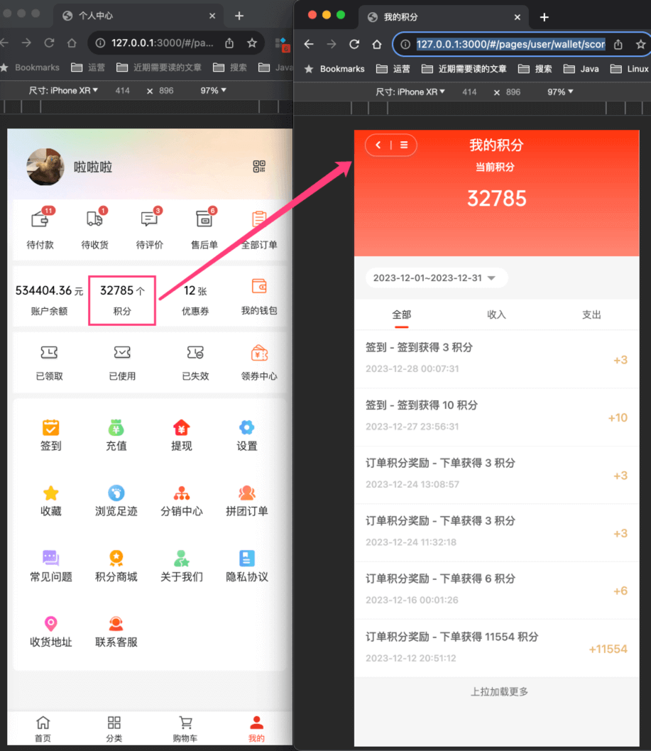 ② 会员详情的 [积分] 标签,可以查看 member_point_record 表的记录,对应 views/member/user/detail/UserPointList.vue 组件。如下图所示: