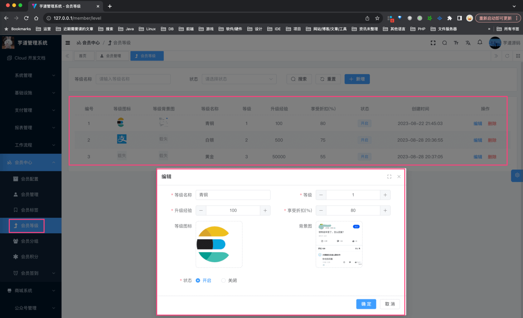 ① 会员等级,对应 [会员系统 -> 会员中心 -> 会员等级] 菜单,对应 yudao-ui-admin-vue3 项目的 views/member/level/index.vue 目录。如下图所示: