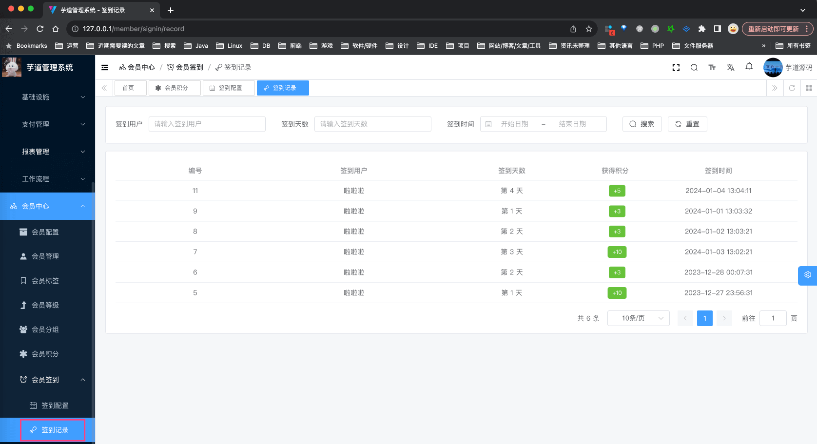 ③ 会员详情的 [签到] 标签,可以查看 member_sign_in_record 表的记录,对应 views/member/user/detail/UserSignList.vue 组件。如下图所示: