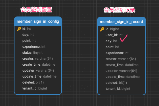 ③ point、experience 字段:签到的分数、奖励经验。冗余的原因,是 member_sign_in_config 表的 point、experience 字段,可能会变更。