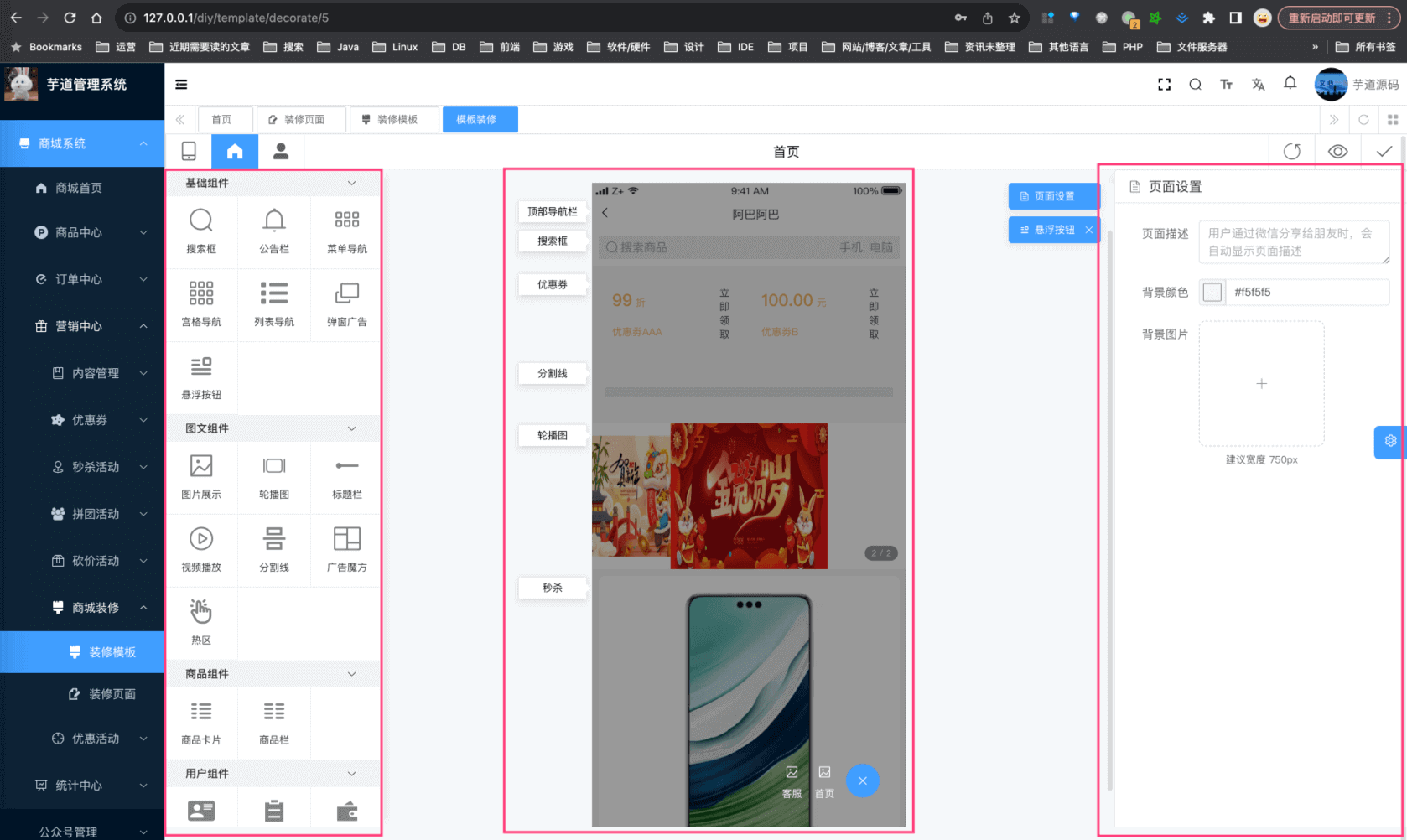 项目支持商城装修,通过简单的拖拉拽,即可进行 uni-app 页面的制作,最终可以在 H5、小程序进行展示。
