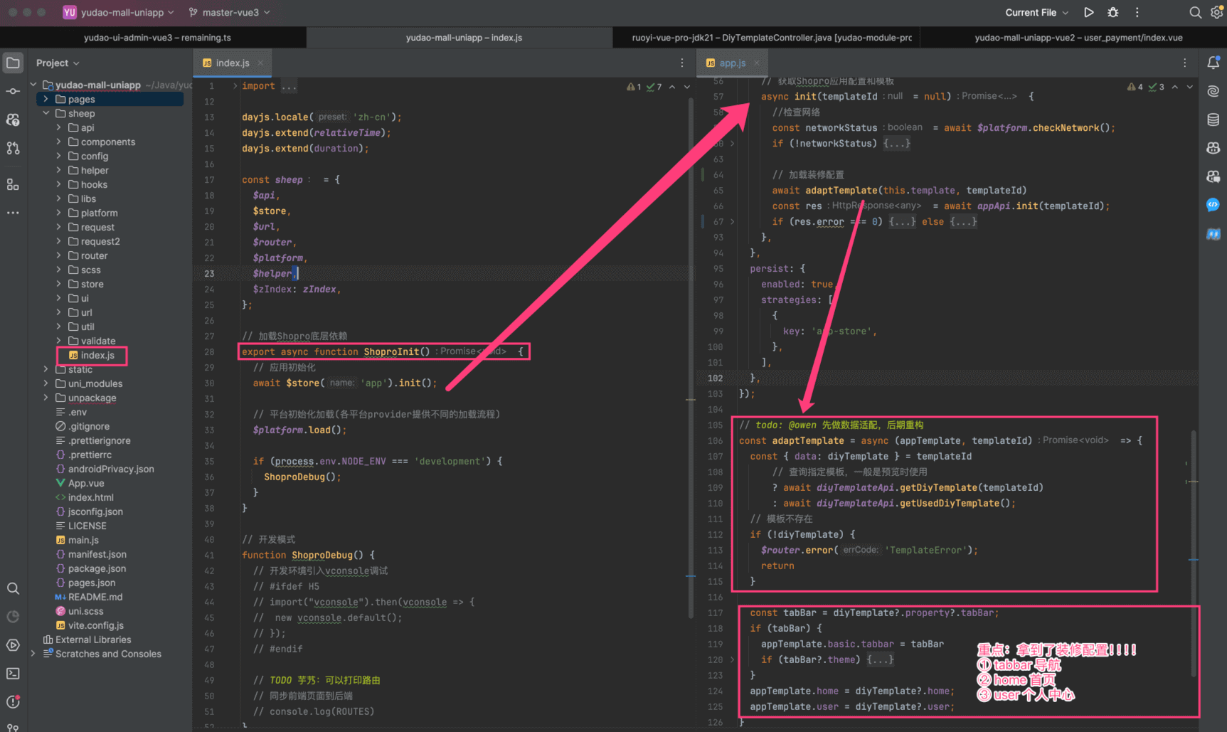 ① uni-app 前台打开时,在 sheep/index.js 的 ShoproInit 方法中,会调用后端接口,获取到默认的装修模版。这样,它就获取到了装修配置。如下图所示: