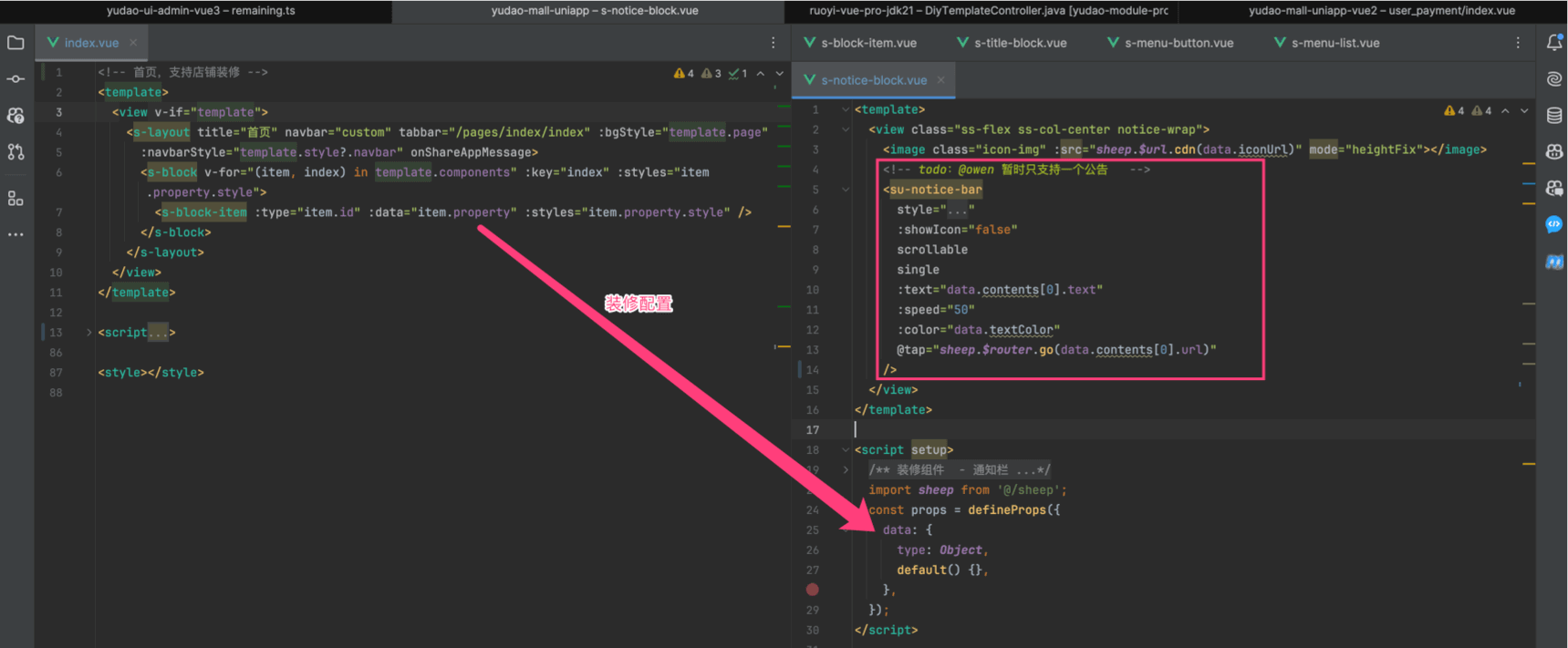 ② 有了装修配置后,首页(pages/index/index.vue)、个人中心(pages/index/user.vue)就可以进行渲染展示。以首页举例子,它会包含多个“装修组件”,每个“装修组件”由 s-block-item 进行渲染。如下图所示: