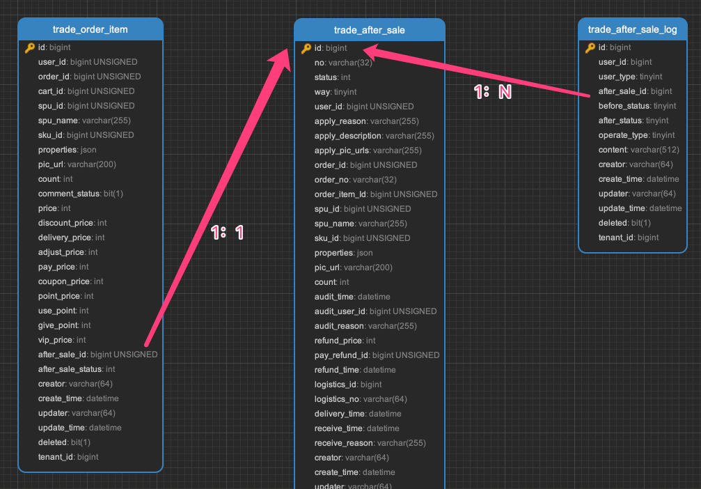 trade_after_sale_:售后订单表trade_after_sale_log:售后订单日志表