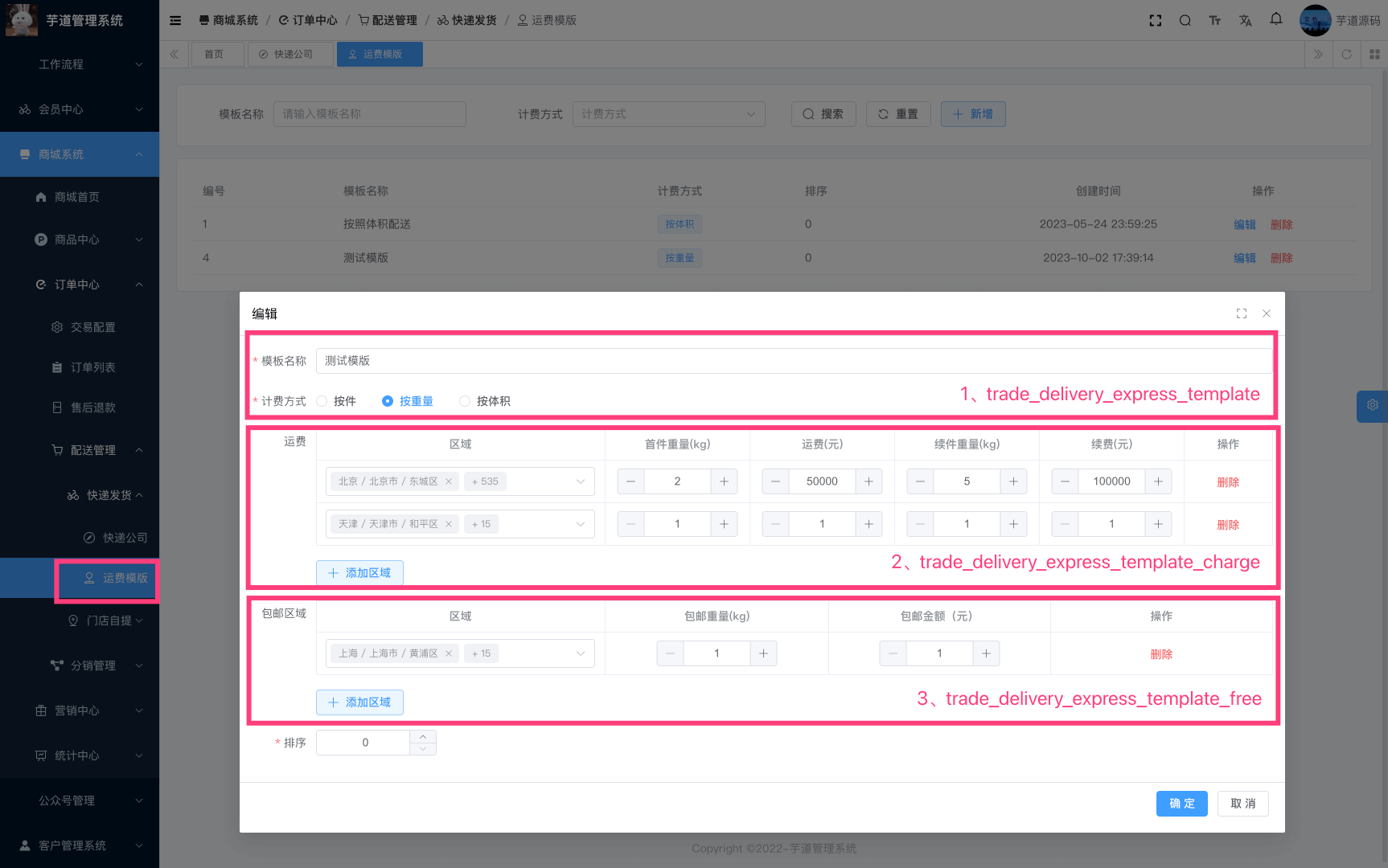 运费模版,由 yudao-module-trade 后端模块的 delivery 包的 DeliveryExpressTemplateService 实现,包括一个主表 + 两个子表: