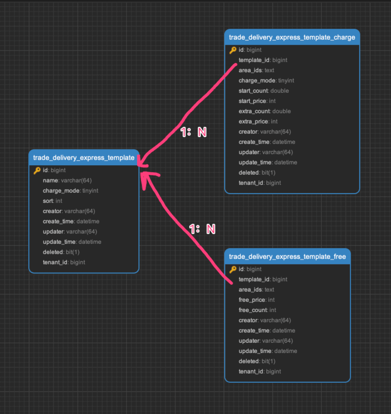 ) ENGINE=InnoDB AUTO_INCREMENT=15 DEFAULT CHARSET=utf8mb4 COLLATE=utf8mb4_unicode_ci COMMENT='快递运费模板计费配置';① template_id 字段:关联 trade_delivery_express_template 表的 id 字段,表示该计费配置属于哪个运费模版。而 charge_mode 字段,只是进行冗余存储,减少查询次数。