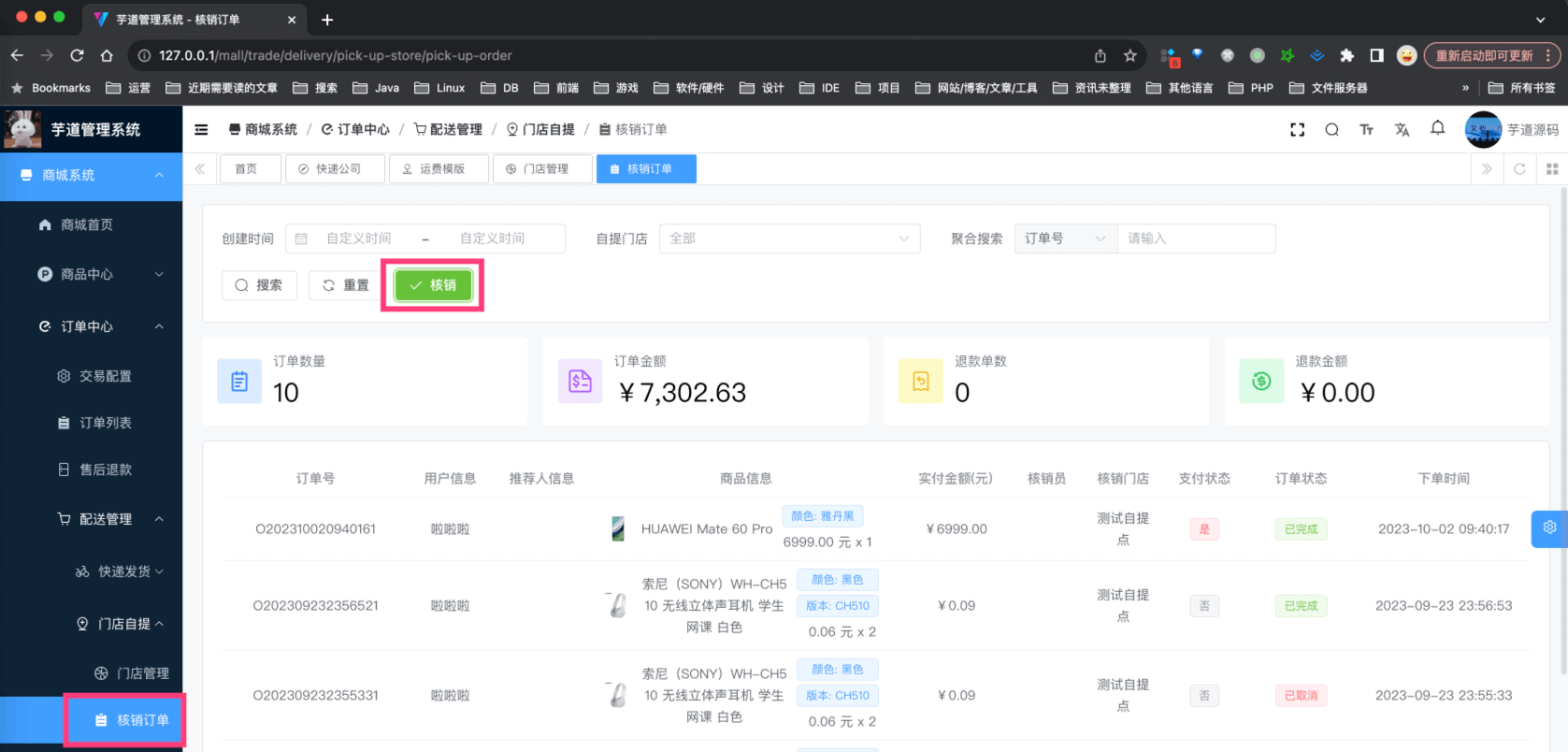 注意!只展示当前登录的管理员用户可核销的订单。关注下“自提门店”这个筛选项!!!