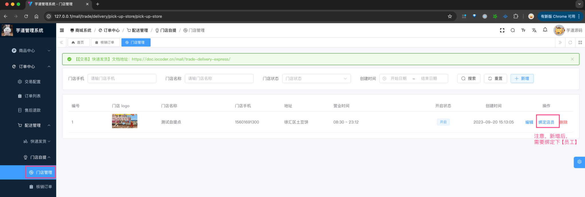 对应 [商城系统 -> 订单中心 -> 配送管理 -> 门店自提 -> 门店管理] 菜单,对应 yudao-ui-admin-vue3 项目的 views/mall/trade/delivery/express 目录。如下图所示: