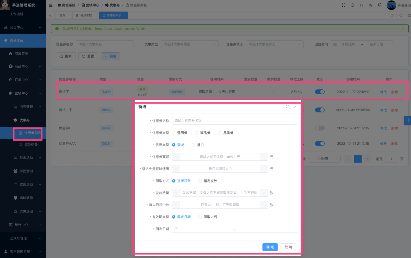 对应 [商城系统 -> 营销中心 -> 优惠劵 -> 优惠劵] 菜单,对应 yudao-ui-admin-vue3 项目的 src/views/mall/promotion/coupon/template 目录。如下图所示: