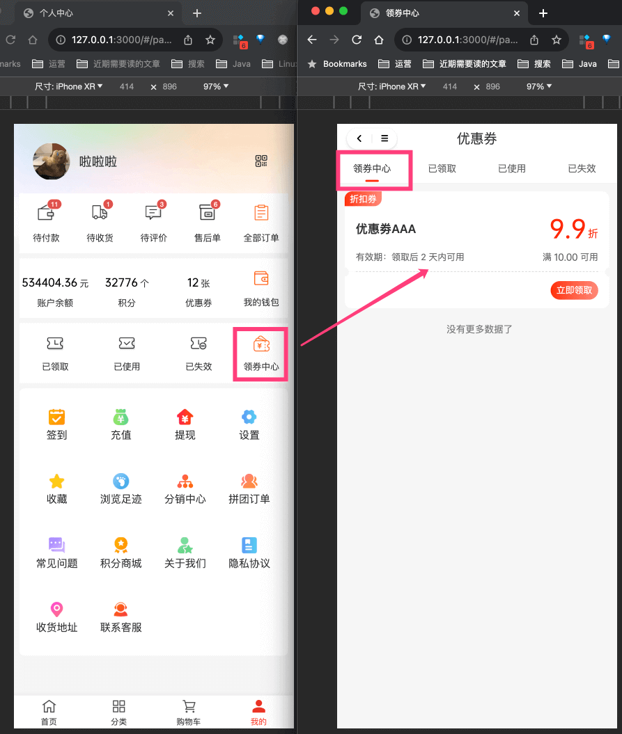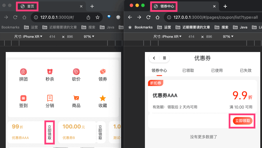 1、直接领取:展示在 uni-app 的 [首页]、[领劵中心]、[商品详情],由用户主动领取。如下图所示:
