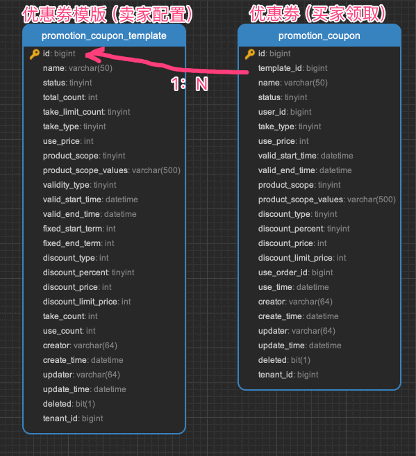 ① 【优惠劵模版】从 template_id 开始到 discount_limit_price 结束,都是从 promotion_coupon_template 中复制过来的,用于记录优惠劵模版的信息。