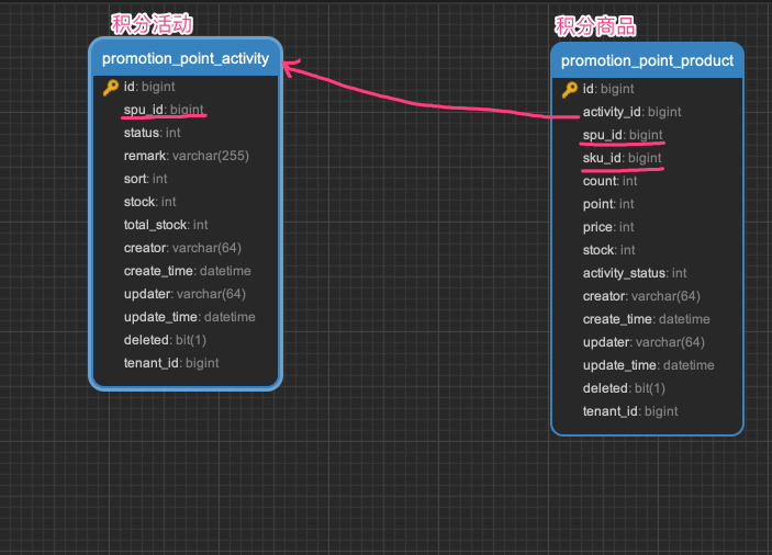 一个积分活动,对应一条 promotion_point_activity 表记录,对应一个商品 SPU。而每个商品 SKU 在该活动下可以单独配置兑换价格,所以会有多条 promotion_point_product 子表记录。