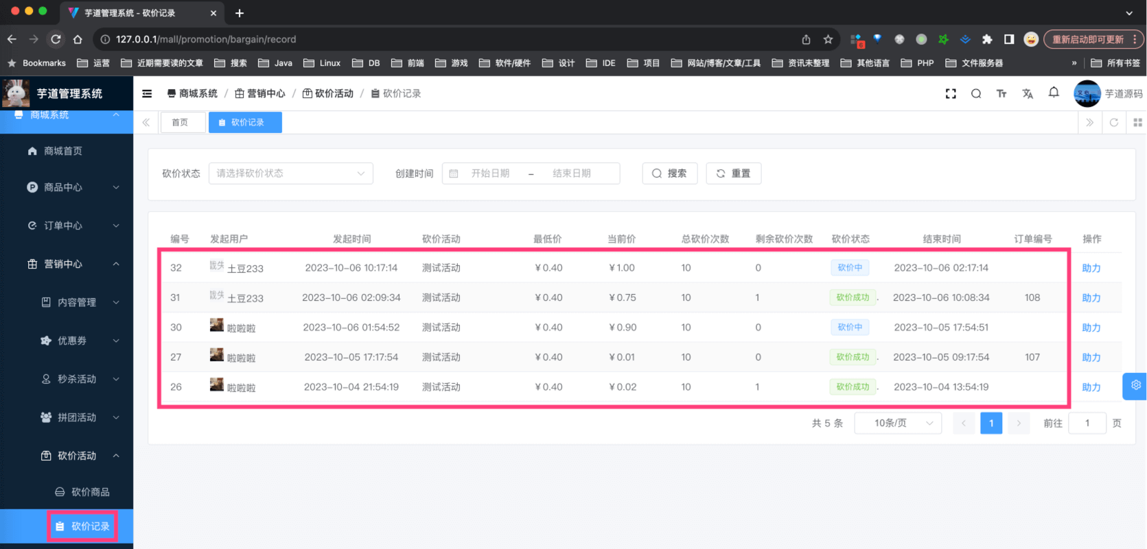 对应 [商城系统 -> 营销中心 -> 砍价活动 -> 砍价记录] 菜单,对应 yudao-ui-admin-vue3 项目的 views/mall/promotion/bargain/record 目录。如下图所示: