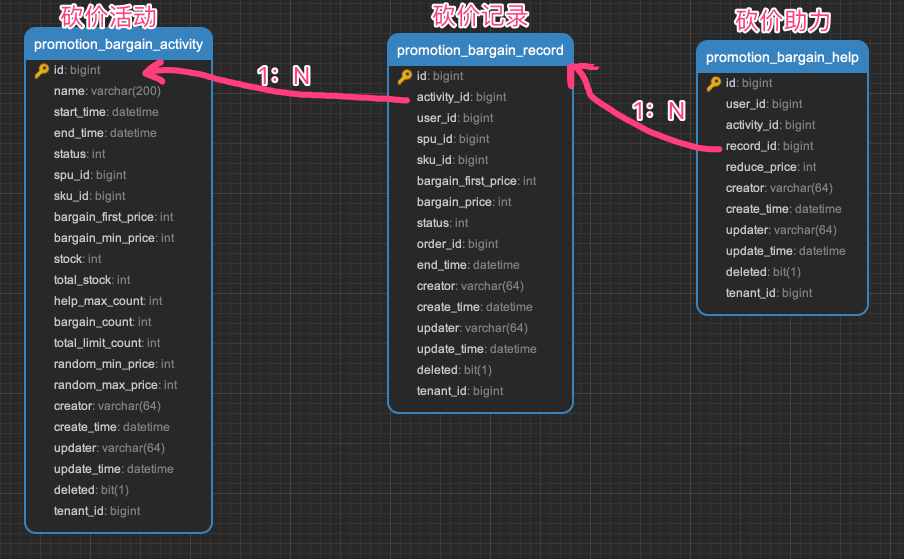 ① 【活动信息】activity_id 字段:砍价活动编号,对应 promotion_bargain_activity 表的 id 字段。其它 spu_id、sku_id 字段,都是冗余字段,方便查询。