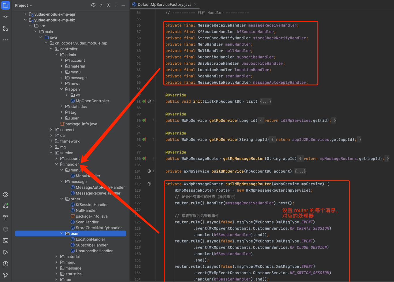 核心逻辑是第二步,再解析到消息后,交给 WxMpMessageRouter 进行消息的处理。WxMpMessageRouter 在 DefaultMpServiceFactory 初始化,设置每种消息对应的 handler 处理器。如下图所示: