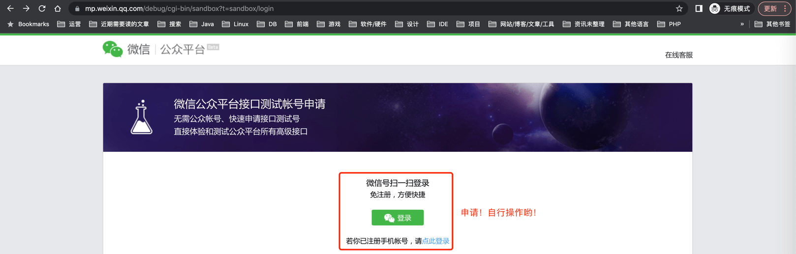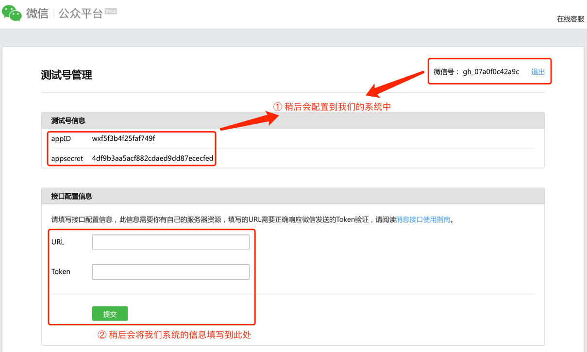 ① 如果你还没有公众号,可以申请一个测试帐号。