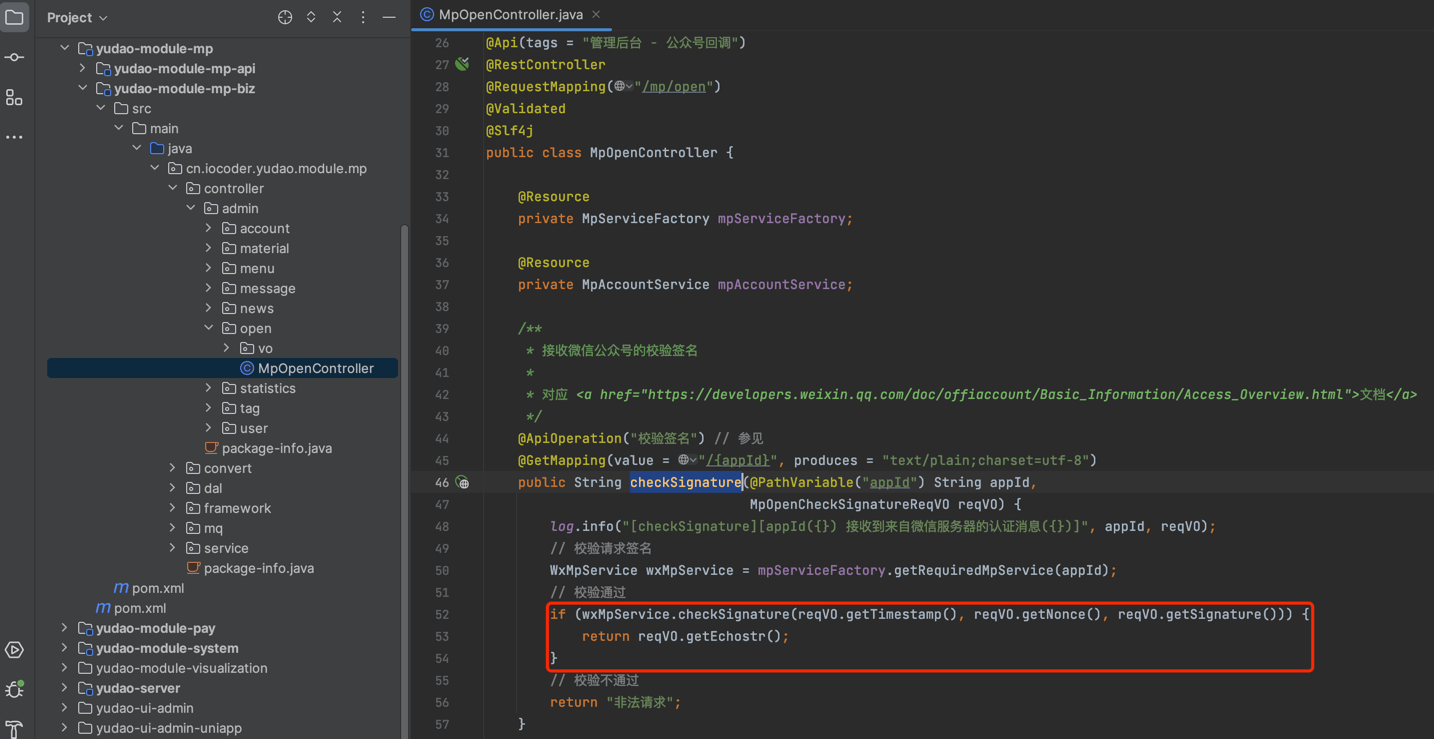 在 第三步,配置接入信息 时,微信公众号会回调系统的 GET /admin-api/mp/open/{appID} 接口,进行接入配置的验证。对应 MpOpenController 类的 checkSignature 方法,如下图所示: