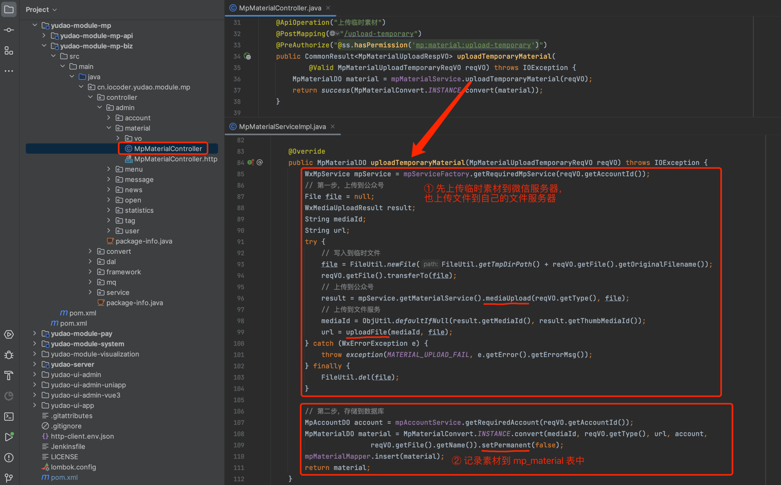 此时,可调用 MpMaterialController 的 uploadTemporaryMaterial 方法对应的接口,实现了上传【临时】素材到公众号。如下图所示: