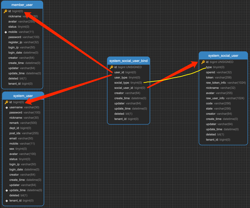 ① 三方登录完成时,系统会将三方用户存储到 system_social_user 表中,通过 type 标记对应的第三方平台。