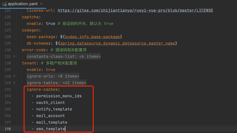 注意!!!默认配置下,Spring Cache 都开启 Redis Key 的多租户隔离。如果不需要,可以将 Key 添加到 yudao.tenant.ignore-caches 配置项中。如下图所示: