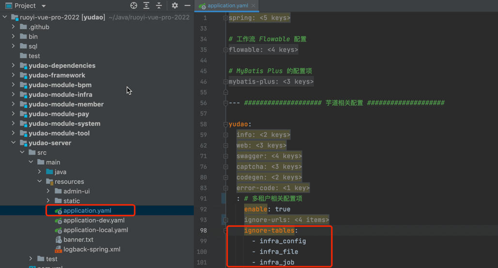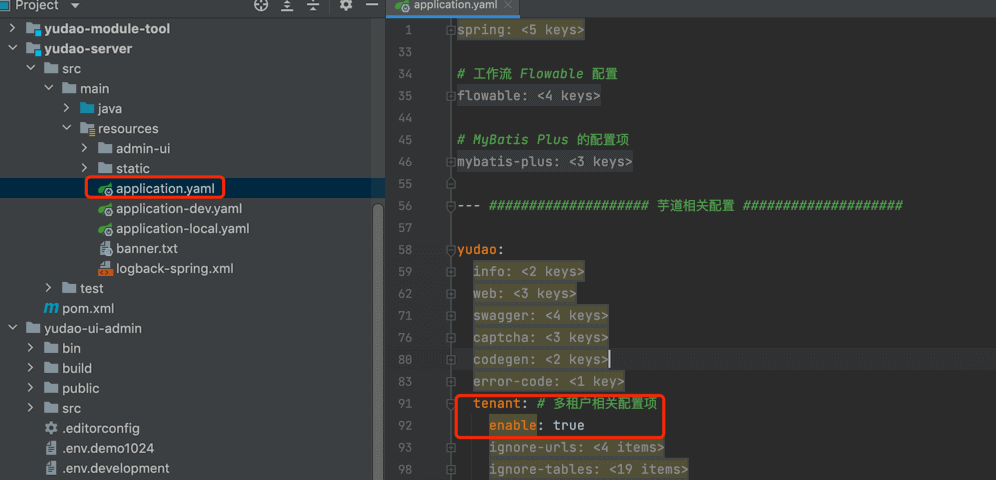 ② 无需开启多租户的表,需要添加表名到 yudao.tenant.ignore-tables 配置项目。例如说: