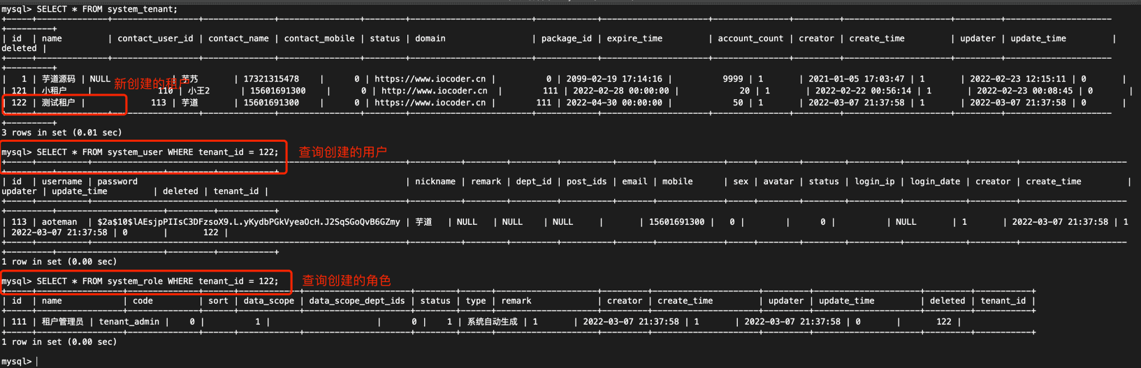 ① 需要开启多租户的表,必须添加 tenant_id 字段。例如说 system_users、system_role 等表。