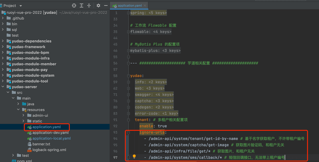 ② 注意:如果你的 HTTP 接口是查询个人相关的信息,不能进行租户的切换,例如说:登录用户的个人信息等。此时,yudao.tenant.ignore-urls 配置项进行添加。