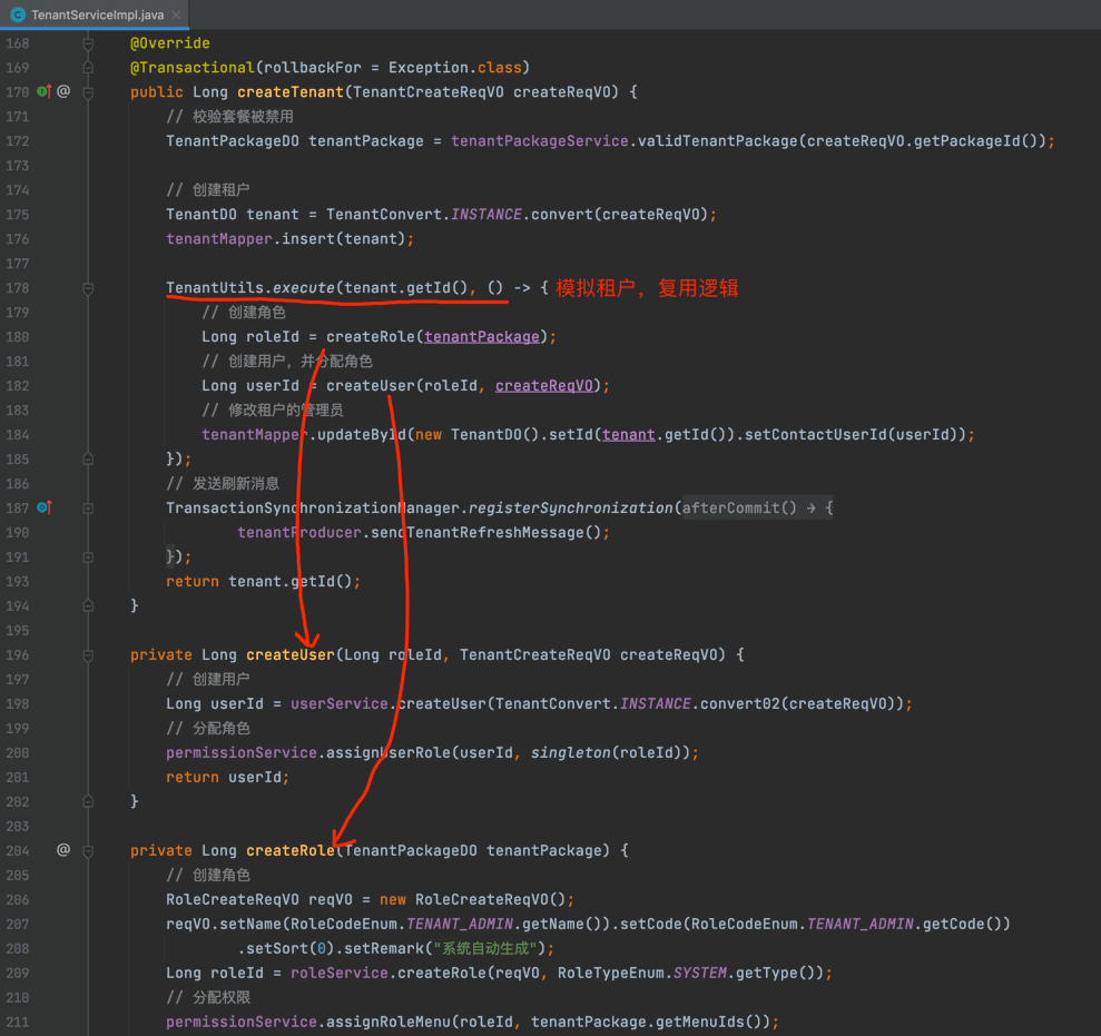 例如说:在 TenantServiceImpl 的 #createTenant(...) 方法,在创建完租户时,需要模拟该租户,进行用户和角色的创建。如下图所示: