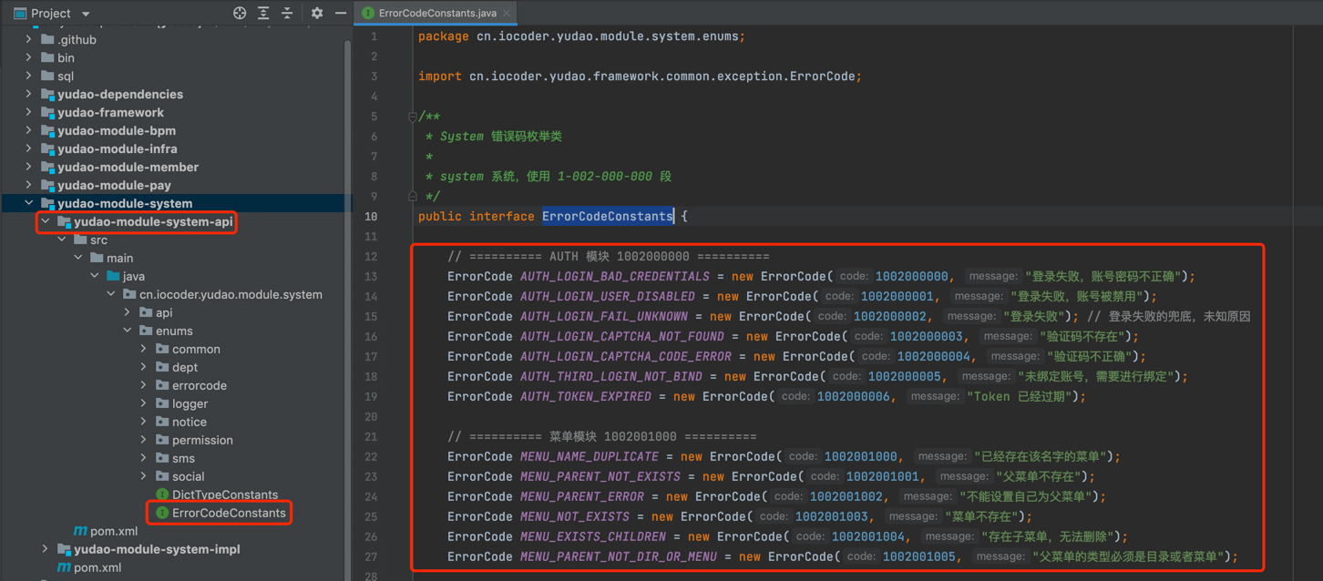 ② 每个业务模块,定义自己的 ErrorCodeConstants 错误码枚举类。以 yudao-module-system 模块举例子,代码如下: