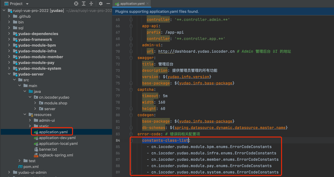 通过 yudao.error-code.constants-class-list 配置项,设置需要自动添加的 ErrorCodeConstants 错误码枚举类。如下图所示: