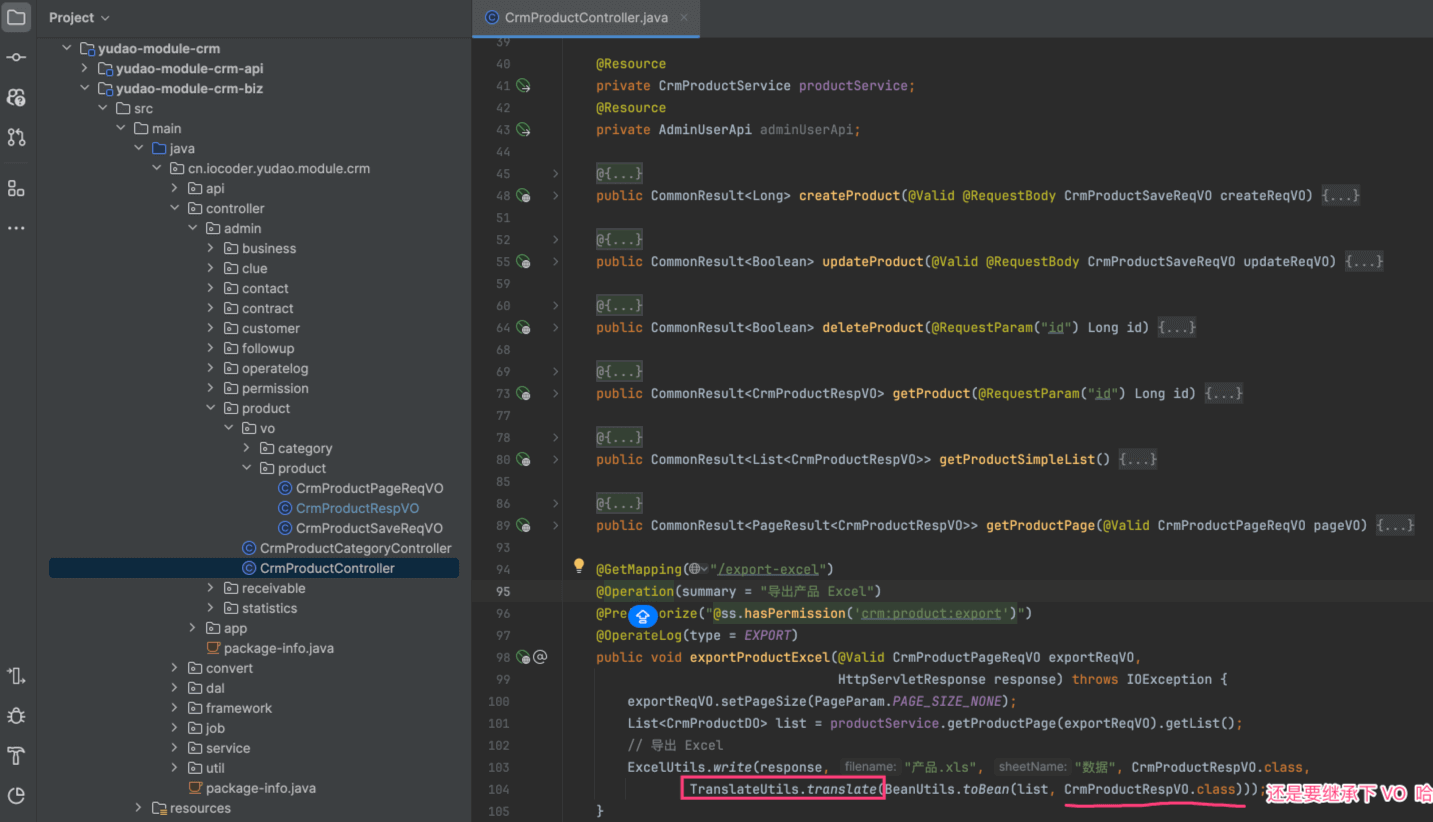 跨模块翻译,指的是在不同模块,进行数据翻译。例如说,CrmProductRespVO 属于 yudao-module-crm 模块,需要读取 yudao-module-system 模块的 AdminUserDO 数据。