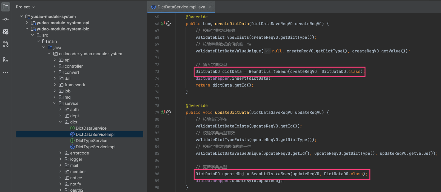 1、在简单场景,直接使用 BeanUtils 的 #toBean(...) 方法,如下图所示: