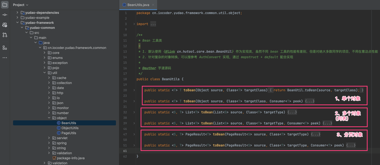 项目提供了 BeanUtils 类,它是基于 Hutool 的 BeanUtil 封装一层。如下图所示: