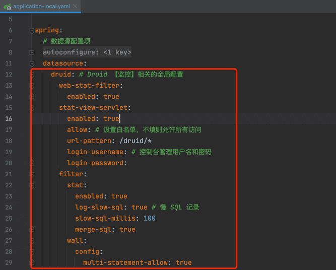 在 application-local.yaml 配置文件中,通过 spring.datasource.druid 配置项,仅仅设置了 Druid 监控相关的配置项目,具体数据库的设置需要使用 Dynamic Datasource 的配置项。如下图所示: