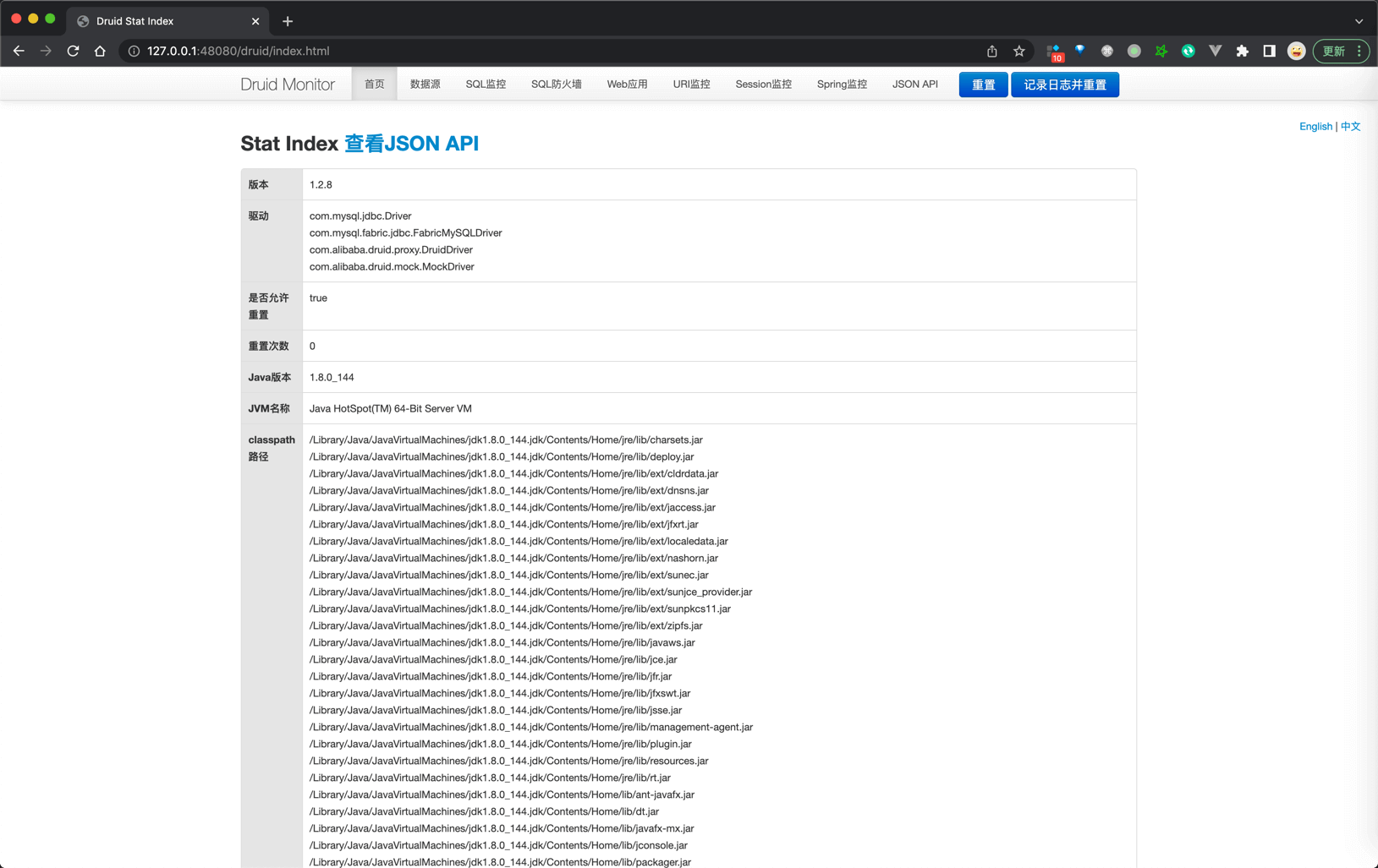 ① 访问后端的 /druid/index.html 路径,例如说本地的 http://127.0.0.1:48080/druid/index.html 地址,可以查看到 Druid 监控界面。如下图所示: