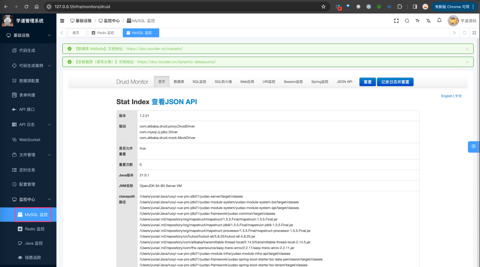 - 数据连接池:基于 Alibaba Druid 实现,额外提供监控的能力。