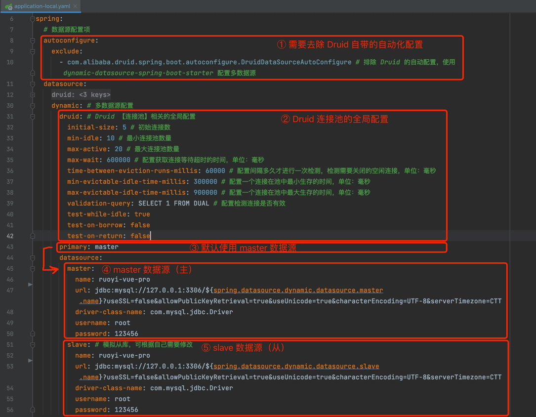 在 application-local.yaml 配置文件中,通过 spring.datasource.dynamic 配置项,配置了 Master-Slave 主从两个数据源。如下图所示: