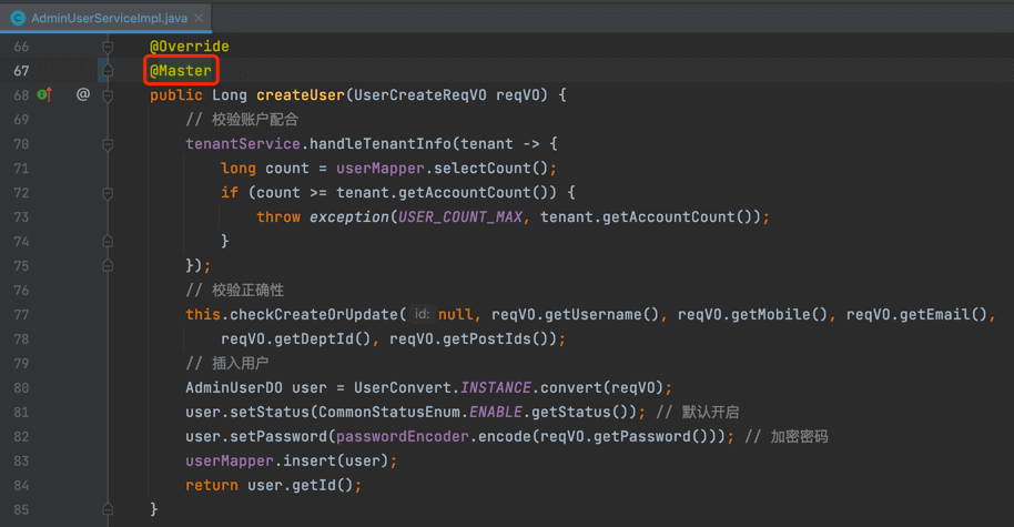 由于项目的 spring.datasource.dynamic.primary 为 master,默认使用【主】库,所以无需手动添加 @Master 注解。
