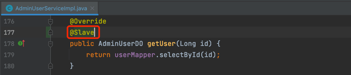 在方法上添加 @Slave 注解,使用名字为 slave 的数据源,即使用【从】库,一般适合【读】场景。示例如下图: