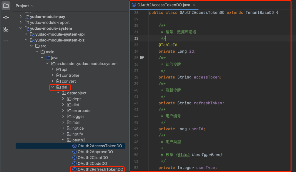 新建 OAuth2AccessTokenDO 类,访问令牌 Access Token 类。代码如下: