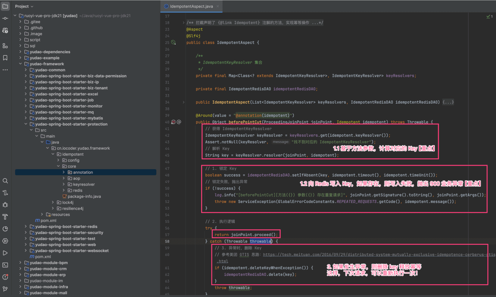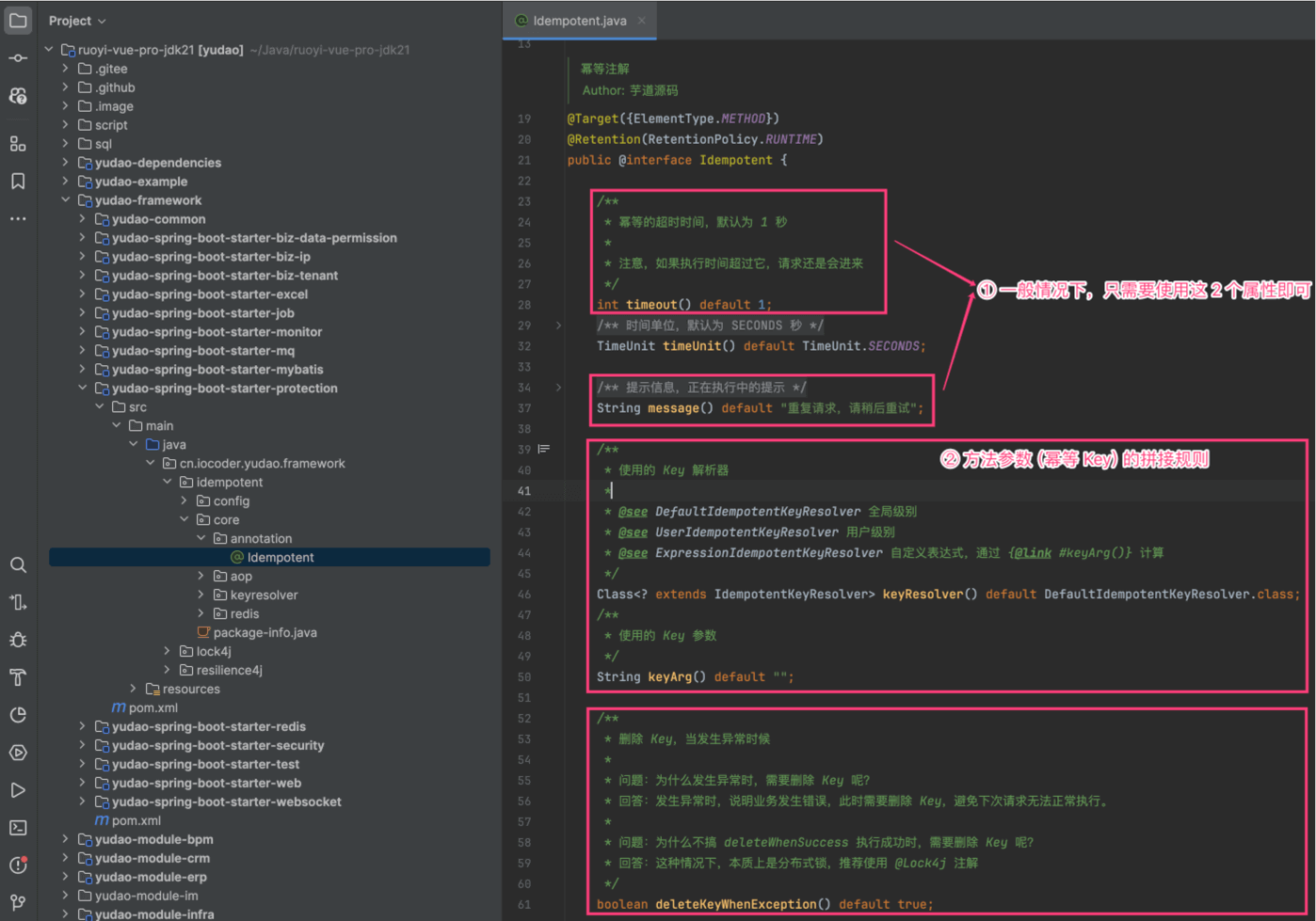 yudao-spring-boot-starter-protection 技术组件,由它的 idempotent 包,提供声明式的幂等特性,可防止重复请求。例如说,用户快速的双击了某个按钮,前端没有禁用该按钮,导致发送了两次重复的请求。