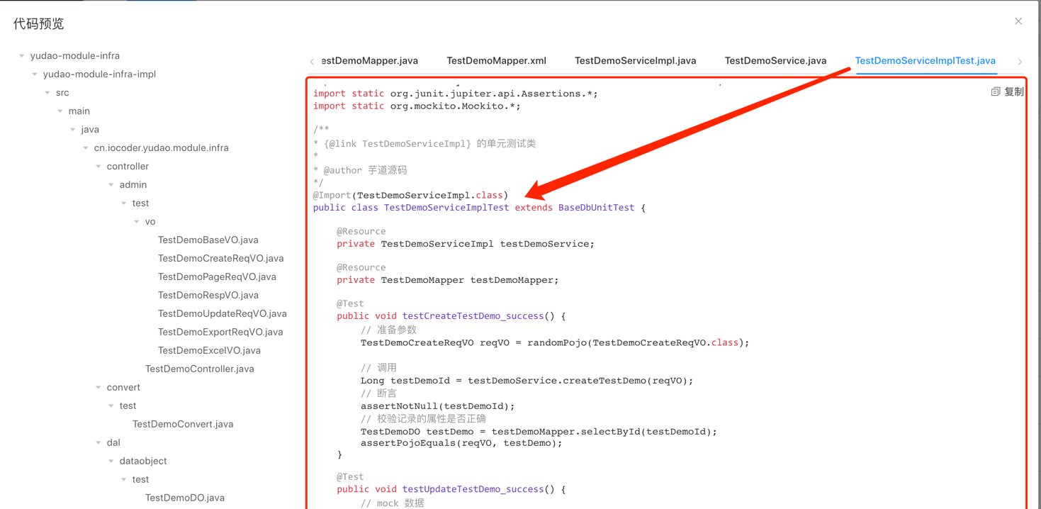 另外,[基础设置 -> 代码生成] 菜单的代码生成器功能,已经生成了绝大多数的单元测试的逻辑,这里主要是希望让你了解单元测试的具体使用,所以并没有使用它。如下图所示: