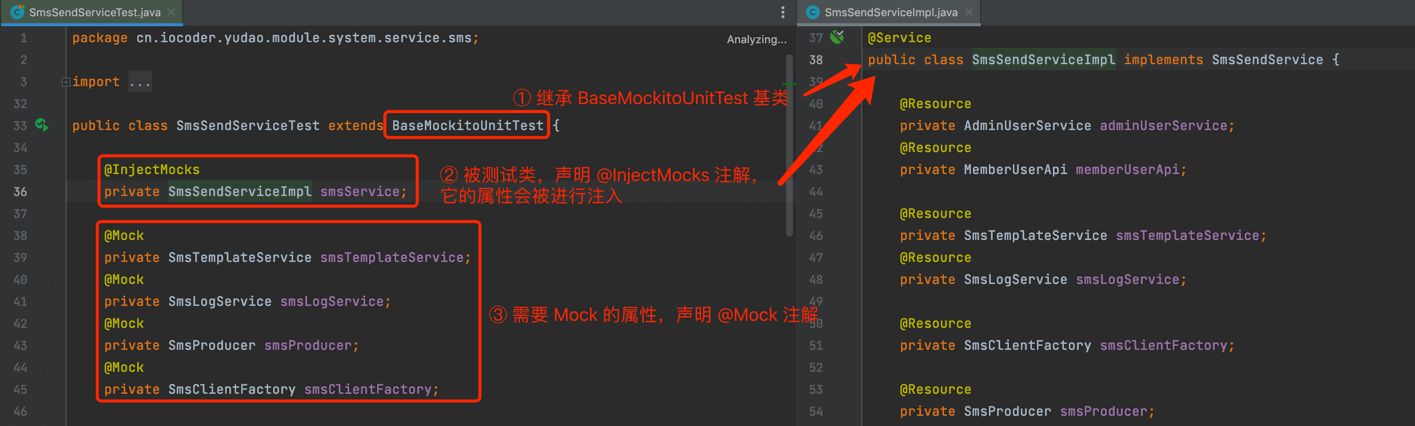 一些类由于不依赖 MySQL 和 Redis,可以通过继承 BaseMockitoUnitTest 基类,实现纯 Mockito 的单元测试。例如说 SmsSendServiceTest 单元测试类,代码如下: