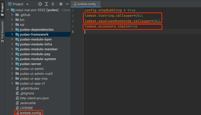 在项目的根目录有 lombok.config 全局配置文件,开启链式调用、生成的 toString/hashcode/equals 方法需要调用父方法。如下图所示: