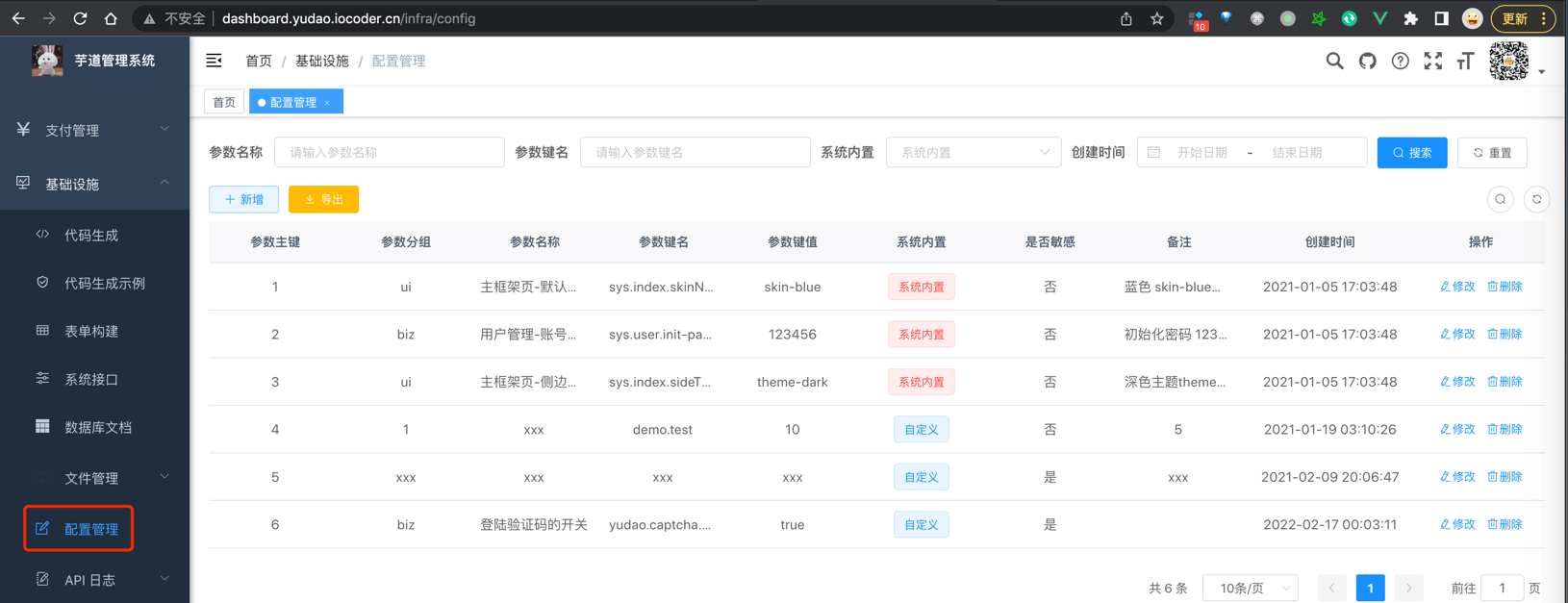 ) ENGINE=InnoDB AUTO_INCREMENT=8 DEFAULT CHARSET=utf8mb4 COLLATE=utf8mb4_unicode_ci COMMENT='参数配置表';key字段,对应到 Spring Boot 配置文件的配置项,例如说yudao.captcha.enable、sys.user.init-password等等。
