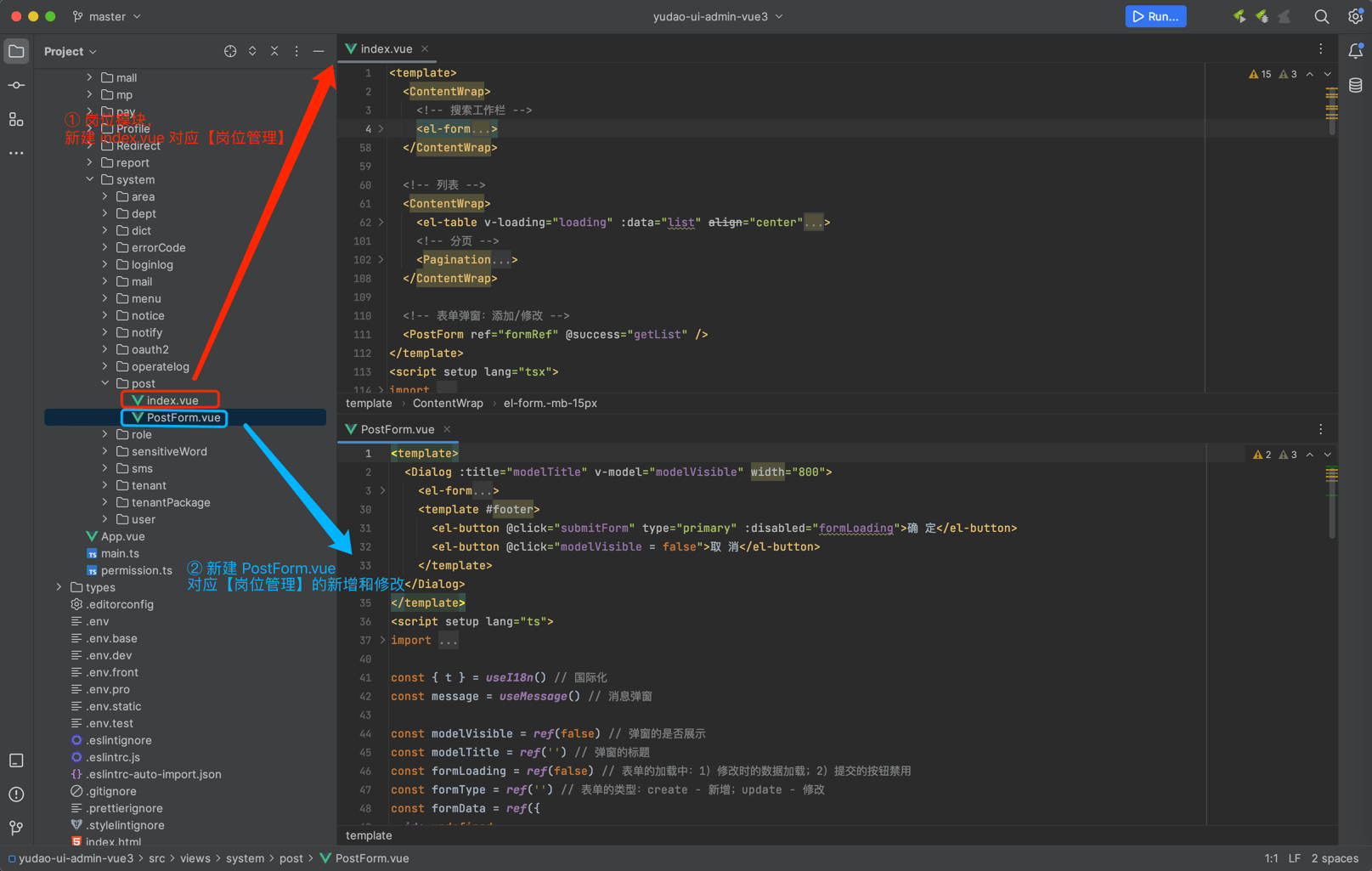 每个模块的业务组件,可实现在 views 目录下,自己模块的目录的 components 目录下,避免单个 .vue 文件过大,降低维护成功。