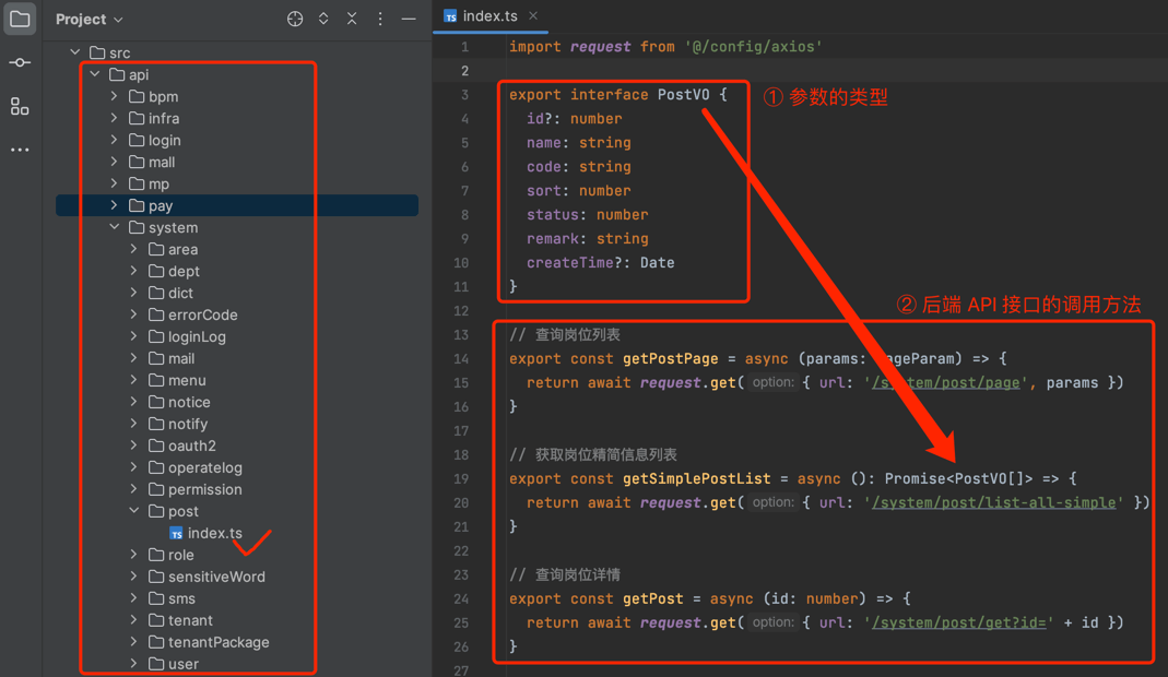 request方法,发起对后端 RESTful API 的调用。 interface类型:定义了 API 的请求参数和返回结果的类型,对应后端的 VO 类型。