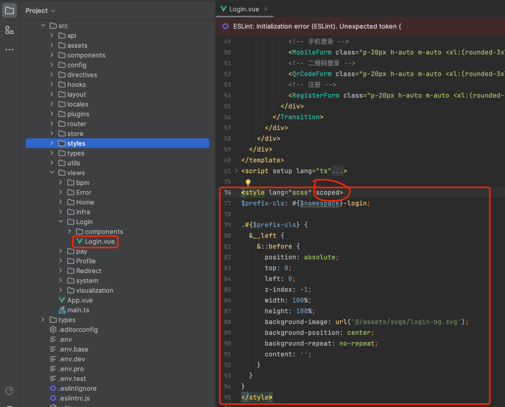 ② 每个 .vue 页面,可在 <style /> 标签中添加样式,注意需要添加 scoped 表示只作用在当前页面里,避免造成全局的样式污染。